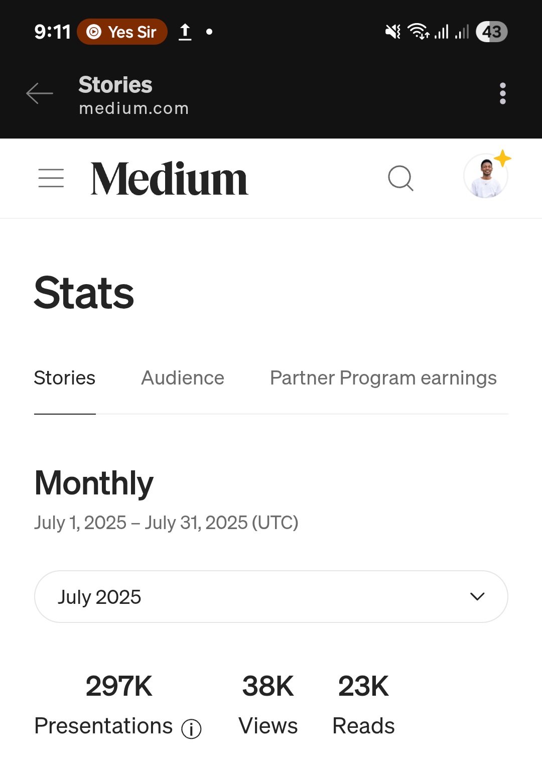 Screenshot of my readership (traffic) stats for a month on Medium.